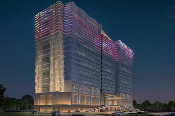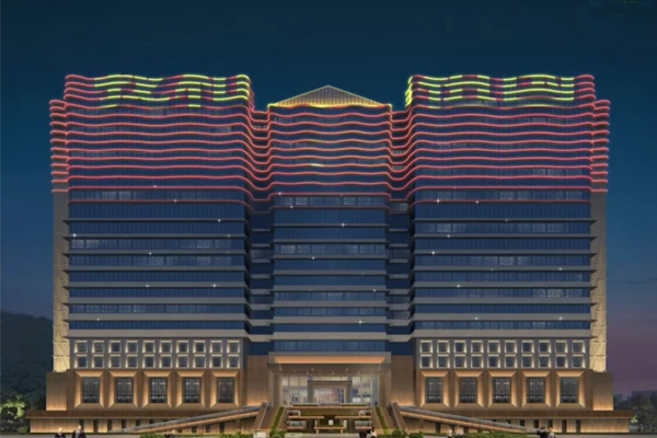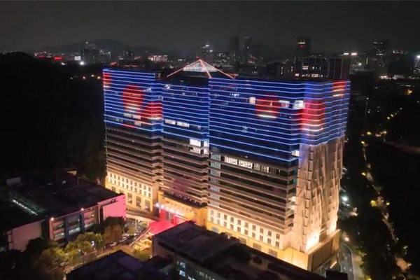 建筑頂部幕墻采用 RGBW 全彩燈光,通過智能控制,以立面動態(tài)圖案與定制動畫演繹企業(yè)形象,吸引多視角關(guān)注,深化企業(yè)品牌辨識度;控制系統(tǒng)設(shè)置平日、節(jié)假日模式,可根據(jù)不同節(jié)日定制專屬光影內(nèi)容,并與廣場噴泉實現(xiàn)光影聯(lián)動,營造不同的場景氛圍。樓身則以大功率燈光做整體烘托,通過光影塑造建筑體量,強化空間視覺存在感。