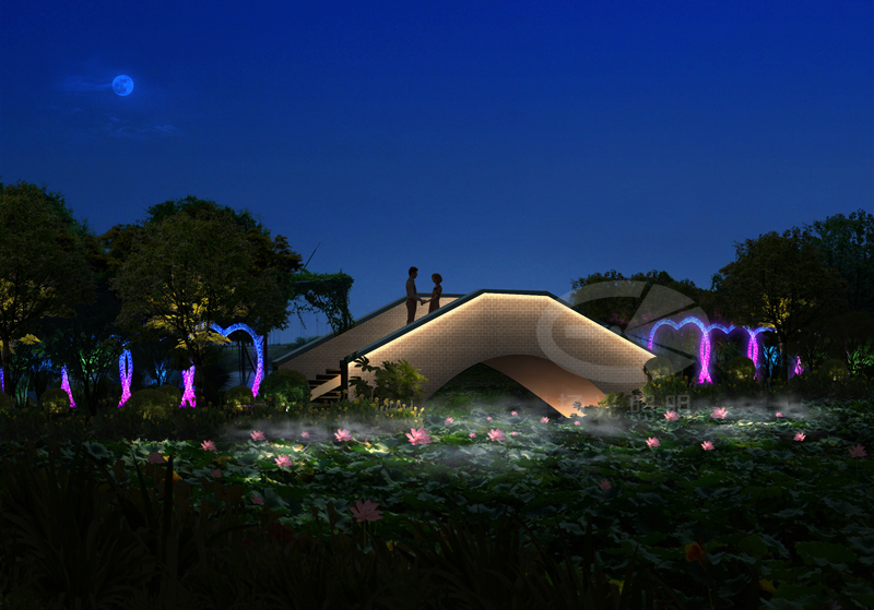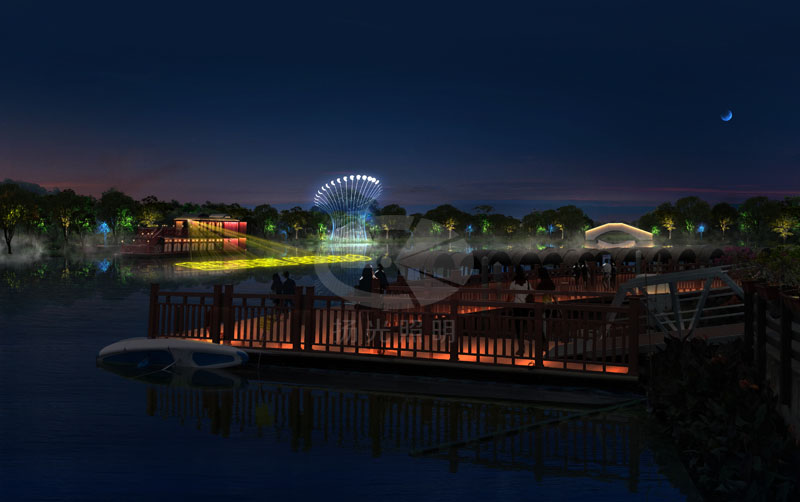 湖岸邊增加水上景觀雕塑——月相變換燈光雕塑,打造“荷塘月色水中映”的仙境。游船碼頭、水上棧道,在燈光設(shè)計(jì)上,兼顧功能性照明的同時(shí),增添燈光色彩,打造七彩水上漫步之路。