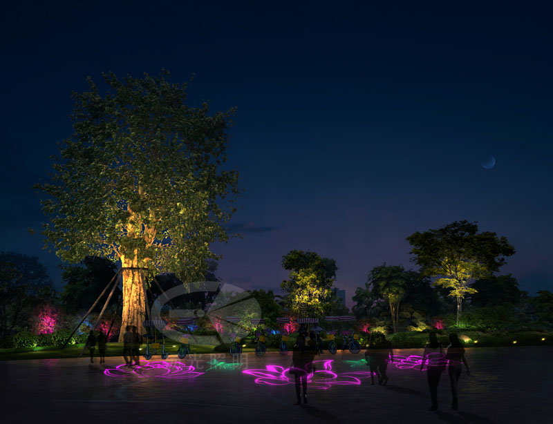 菩提大樹——特色互動(dòng)照明,營(yíng)造特色廣場(chǎng)夜環(huán)境。選用園區(qū)“水、蓮”元素作為燈光表現(xiàn),呈現(xiàn)夜景園區(qū)文化。