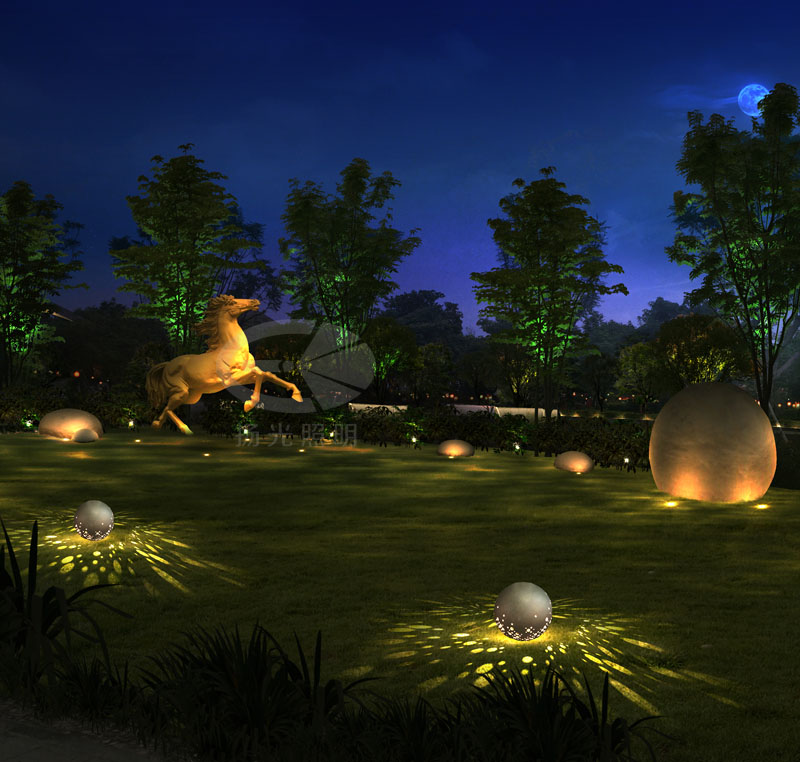 雕塑及景觀石使用投光燈照明,增加球形燈光雕塑呼應(yīng)廣場(chǎng)上的景觀石,整合一體,豐富廣場(chǎng)夜間燈光效果。