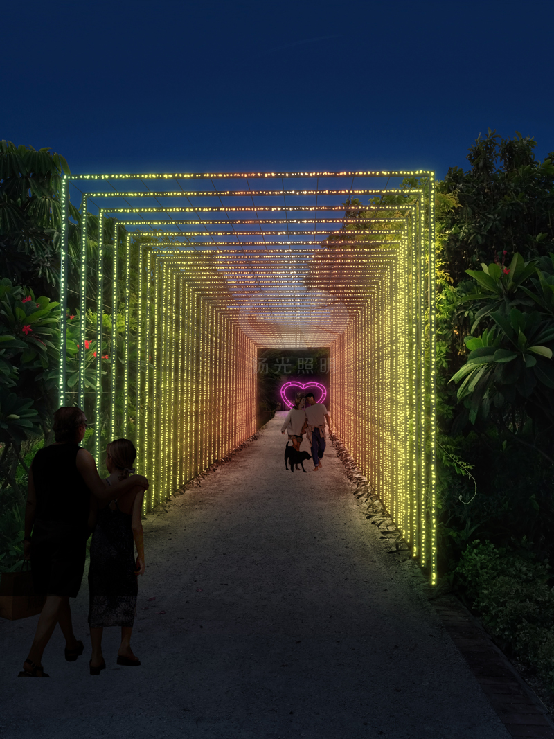 觀賞完心形架后,漫步走上連橋,會(huì)經(jīng)過(guò)我們?cè)O(shè)計(jì)的燈光時(shí)空隧道,絢麗、夢(mèng)幻的燈光效果,仿佛置身于愛(ài)情的時(shí)光隧道,穿越時(shí)空,感受牛郎織女凄美的愛(ài)情故事。