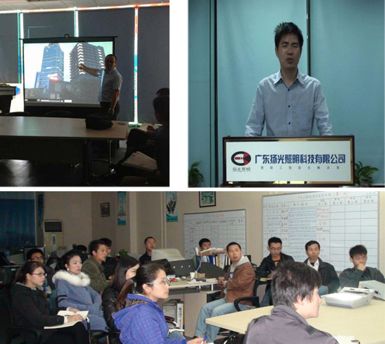為適應(yīng)揚光照明快速發(fā)展的需要,著力培養(yǎng)專業(yè)人才隊伍,全面提升員工整體素質(zhì),提高員工職業(yè)技能,讓員工能夠更專業(yè)更全面的為廣大新老客戶服務(wù)。由公司高層及工程部資深工程師,設(shè)計部,采購部等部門負(fù)責(zé)人為工程部和業(yè)務(wù)部每周六定期舉辦照明知識講座,分享各類經(jīng)典照明工程案例。